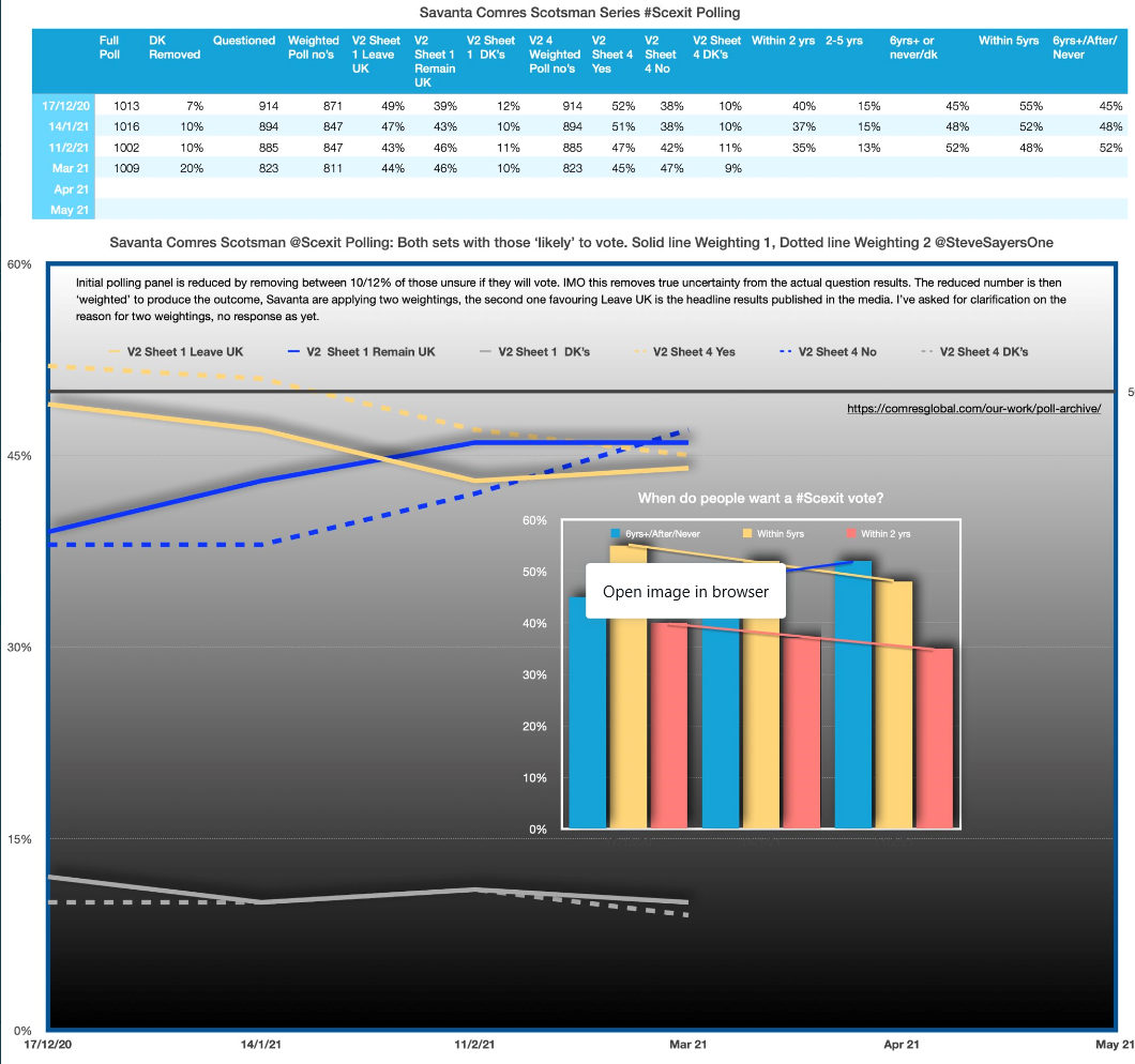 Table showing results from Savanta Comres polling for preference on when to hold a referendum.